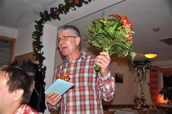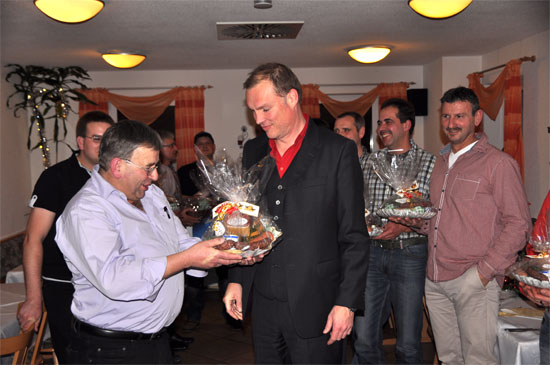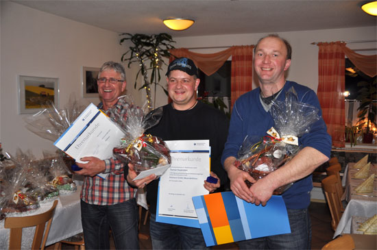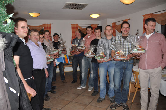 Der Sanitär- und Heizungsinstallationsbetriebs Sitzmann in Bechhofen bei Neuendettelsau nutzte seine traditionelle Weihnachtsfeier im Gasthaus Zum Grünen Baum dieses Jahr für ein Rahmenprogramm der besonderen Art. Neben einem leckeren 3-Gänge-Büffet für die insgesamt 43 Mitarbeiter und ihre Angehörigen standen die Ehrungen für langjährige Betriebszugehörigkeit an. Joachim Fuoss von der Handwerkskammer hatte drei Ehrenurkunden mit den dazugehörigen Nadeln für 25-jährige Betriebszugehörigkeit im Gepäck, dazu erhielten 10 weitere treue „Sitzmänner“ kleine Geschenkkörbe als Dank von der Firma. Reinhold Betz ist bereits seit 27 Jahren im Betrieb, Thomas Hauenstein seit 26 Jahren und auch Herbert Bischoff gehört seit knapp 25 Jahren zum festen „Inventar“. Die Familie Sitzmann bedankte sich zudem bei Roland Meyer, Jochen Weißmann, Stefan Czorniak, Manfred Jäcklin, Jürgen Kahr, Rainer Beuschel, Bernd Schwab, Stefan Meßthaler, Stefan Betz und Christian Schmidt für 22 bis 12 Jahre (absteigende Reihenfolge) zuverlässige Mithilfe im Betrieb. Joachim Fuoss würdigte auch die beeindruckende Zahl der ausgebildeten Lehrlinge – von 1983 bis 2013 lernten 55 Auszubildende ihr Handwerk bei der Firma Sitzmann, das habe Vorbildfunktion. Zwei der aktuellen Auszubildenden stellten dann gleich ihre Vielseitigkeit unter Beweis und präsentierten ein Weihnachtsgedicht. Beim Weihnachtslied baten sie das gesamte Sitzmann-Team um Unterstützung, was gerne gewährt wurde. Mit Spannung wurde die Weihnachtsverlosung erwartet, denn die Tombola enthielt mit hochwertigen Kaffeemaschinen, Werbeartikeln und sogar einem Baustellenradio attraktive Preise. Die Lose waren schnell verteilt und alle Mitarbeiter mit ihren Familien waren eifrig bei der Sache. Die Familie Sitzmann freute sich sehr über die harmonische Weihnachtsfeier und die offizielle Anerkennung ihrer langjährigen Belegschaft.