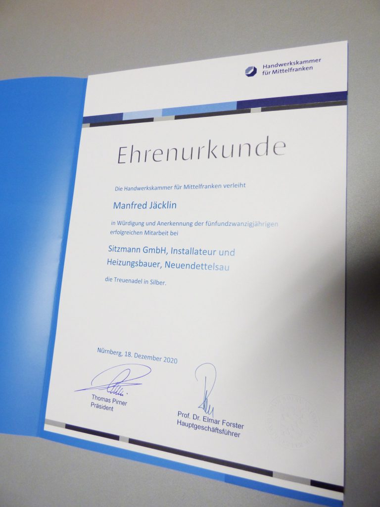 Anerkennung für langjährigen Mitarbeiter der Firma Sitzmann leider ohne traditionelles Rahmenprogramm